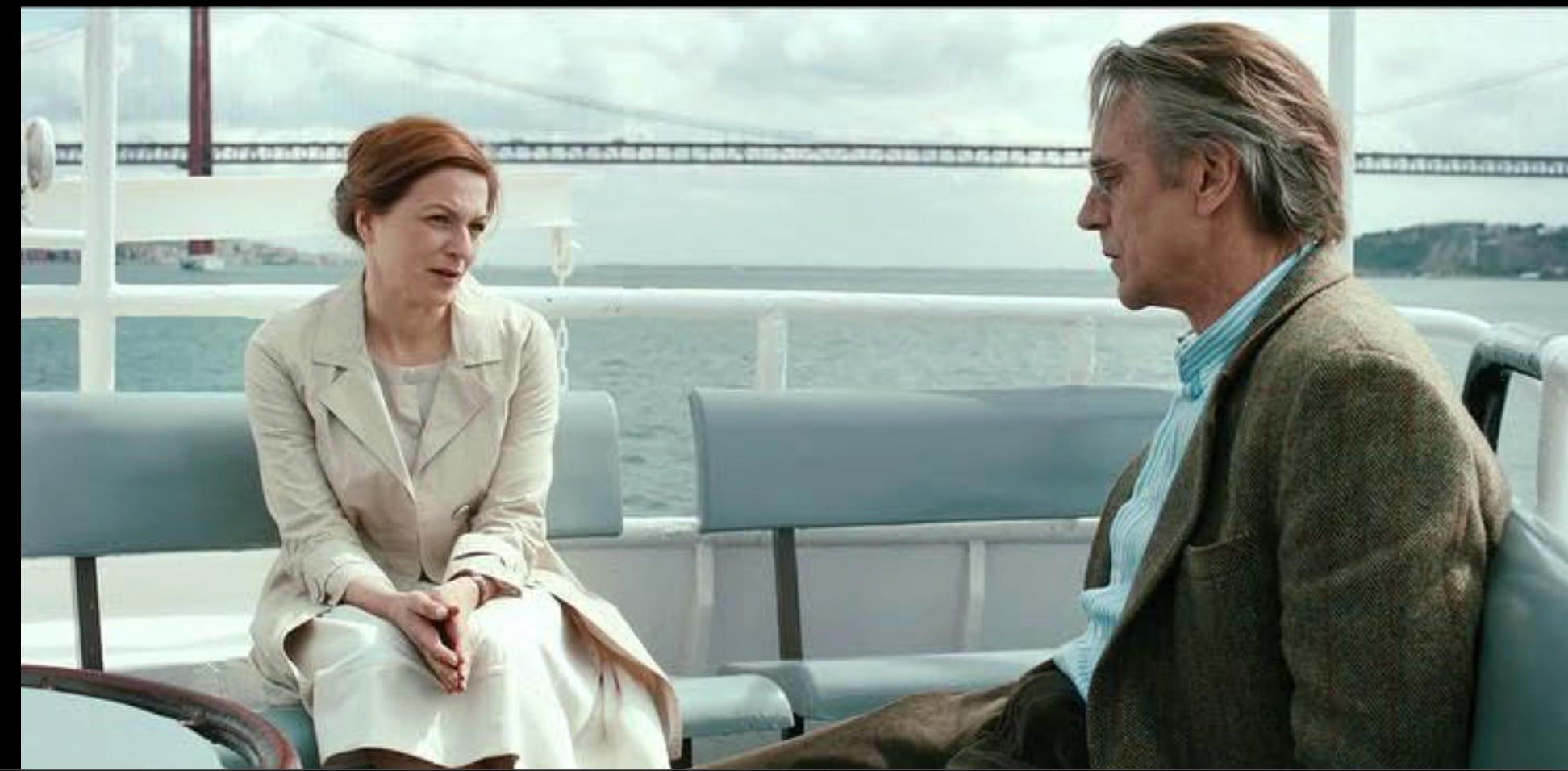 Mundus learns Portuguese, and laboriously reconstructs Amadeu’s life, finding his grave, his sister, his teachers, and eventually his compatriots. He breaks his glasses and gets new ones, much more stylish, and this, too, is not an irrelevant detail. Now he can see better. In the process, he meets the optometrist Mariana, played by the ravishingly beautiful Martina Gedeck, who was in The Lives of Others, another brilliant film. She’s the person sitting with him in the photo above. Her brother, now in a nursing home, knew Amadeu.